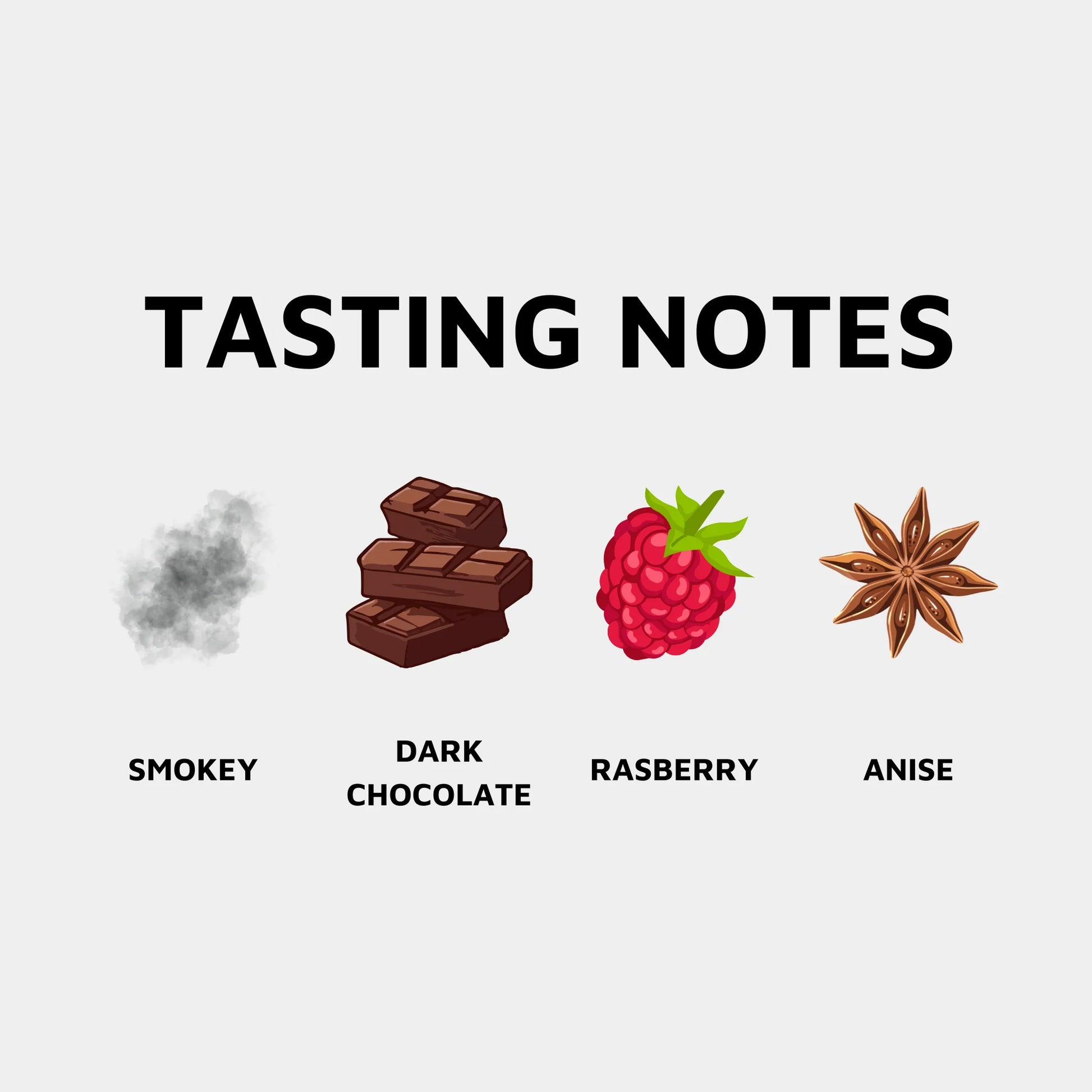 This handcrafted blend opens with a smoky intensity, shifts into a raspberry burst, and hugs the corners with dark chocolate richness before finishing on the bold, exotic note of anise spice. Every sip is a downshift into exhilaration.